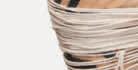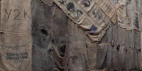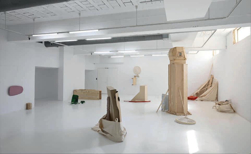 A series of sculptures and spatial interventions in wood and plywood anchor a kind of provisional street scene evoking protest, improvisation and anarchic play (all works Builders of Worlds Very Similar to Ours, 2024–25). The tallest structure resembles a statue boarded up to deter vandalism. Two recessed walls are partially blocked off, the results resembling building site hoardings or barricaded shopfronts. Across the gallery space, objects imitate oversized litter – an enormous drinking straw, snack packets, shards from a smashed headlight – and elements from a demolition or construction site. There are stacks of miniaturized forklift pallets alongside variously scaled cloth versions of the bulk bags commonly found on Barcelona pavements during building renovations and pedestrianization projects. Yet instead of real rubble or sand, they’re cluttered with sculpted bricks,