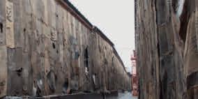 Before seeing the film, you’re already thrown into its uncanny world. The installation opens up like a crime scene dressed by a props department: towers of variously sized cardboard boxes stamped with red question marks and ‘fragile’ tape; an encompassing backdrop of a deserted London, poised for the next episode of