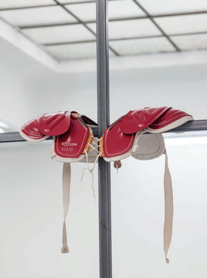 By contrast, Margherita Raso’s Studio (2024) offers a more restrained gesture: a one-to-one replica of her Basel studio window, its iron grid interrupted by a pair of red 1950s Wilson shoulder pads lodged between two frames. Simultaneously protected and exposed, their form evokes an absent body, bracing for impact. Their history intensifies this latent violence: Wilson began as a meatpacking company before turning to sports gear produced from animal by-products. The grid, which invokes modernist order while also recalling the so-called kill box of contemporary military tactics, materializes a broader superstructure of capitalist-imperialist power haunted by the trace of the other: bodies excluded from regimes of visibility structured by race, gender and class. Raso underscores how categorization is never neutral: hierarchies of value are shaped by who falls inside the grid and who does not.
