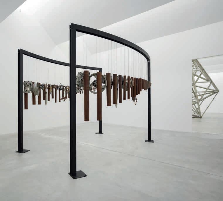 Factory reappears in Untitled (yellow square) (2024), a composition of enamelled steel elements lifted from the brand’s familiar signage, with holes for fastening still visible. Elsewhere, Ducati ×  Lavinia (2024) – originally displayed at the Loggia dei Vini pavilion in Rome’s Villa Borghese gardens – suspends the parts of a gutted Ducati motorcycle from a pair of meticulously curved metal beams, the components retooled as a set of chimes – machinery turned into instrument and spectacle. The resulting exhibition is a semi-abstract narrative – visually minimalist yet charged with contextual meaning – which unfolds across the museum’s eight rooms. Their high ceilings confer an almost sacred atmosphere that recasts Overton’s sculptures as timeless relics.