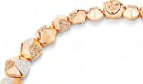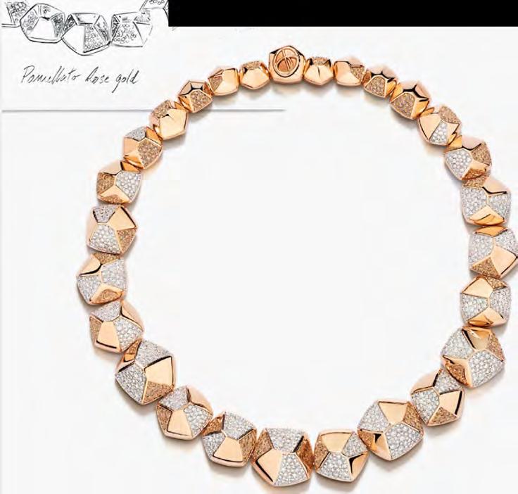 The Pentagoni necklace by Pomellato features cascading three-dimensional pentagons in 18K rose gold, adorned with alternating white and brown diamonds, each meticulously hand-set by master Italian artisans. A timeless statement, blending architectural design with impeccable craftsmanship.