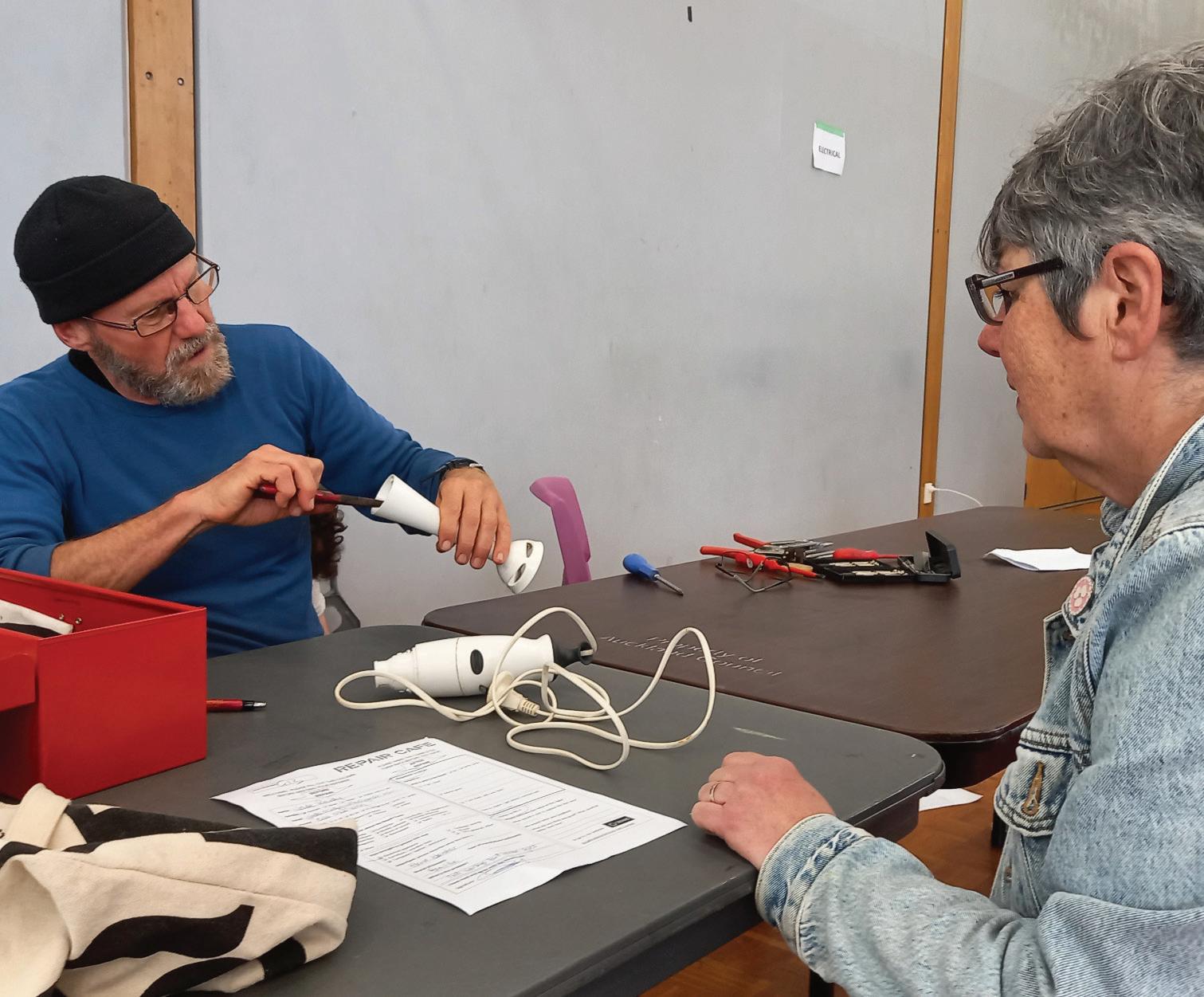 Volunteer, Mark, attempts to uncover what’s wrong with Christine’s hand blender at the September Repair Café in New Lynn.