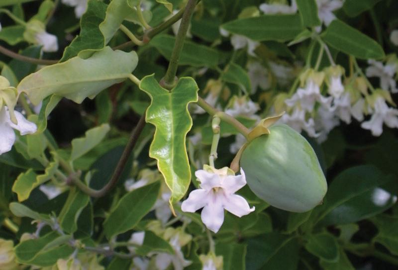 Grows densely and smothers native plants on the ground and in the subcanopy. Evergreen climber with tough stems, dark green leaves, red/pink flower buds and white, five-petalled flowers. Cut vines and leave upper stems to die in trees, alternatively dig out roots. Rot down in a water barrel or dispose in community weed bins.