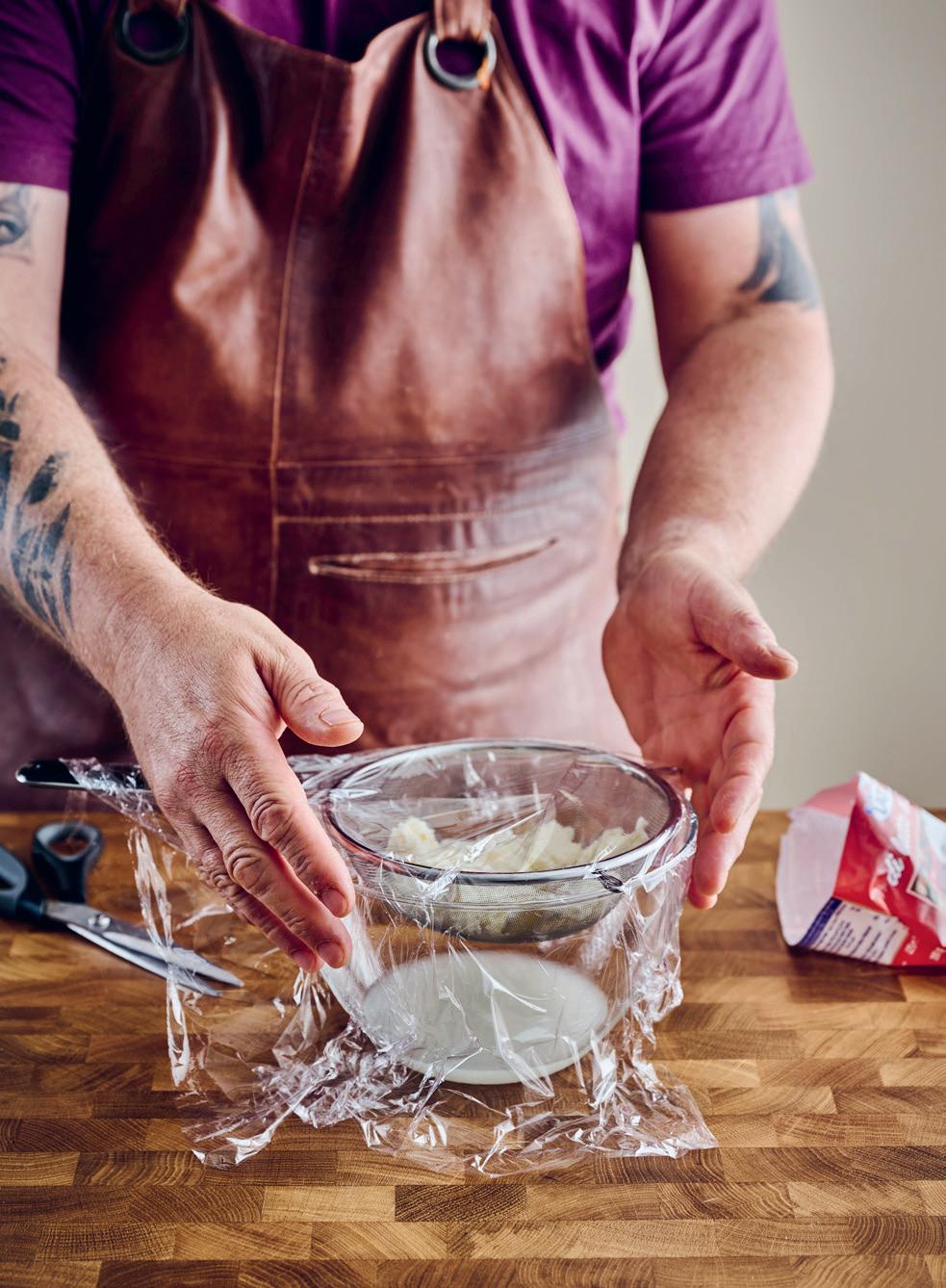 Når deigen er ferdig eltet, tas den ut av eltebollen og legges på kjøkkenbenken hvor den skal hvile i 20–30 minutter. Ha litt olivenolje på benken, og brett deigen noen ganger. Dekk den med plastfolie eller en oppskåret matpose/frysepose slik at den ligger tett.