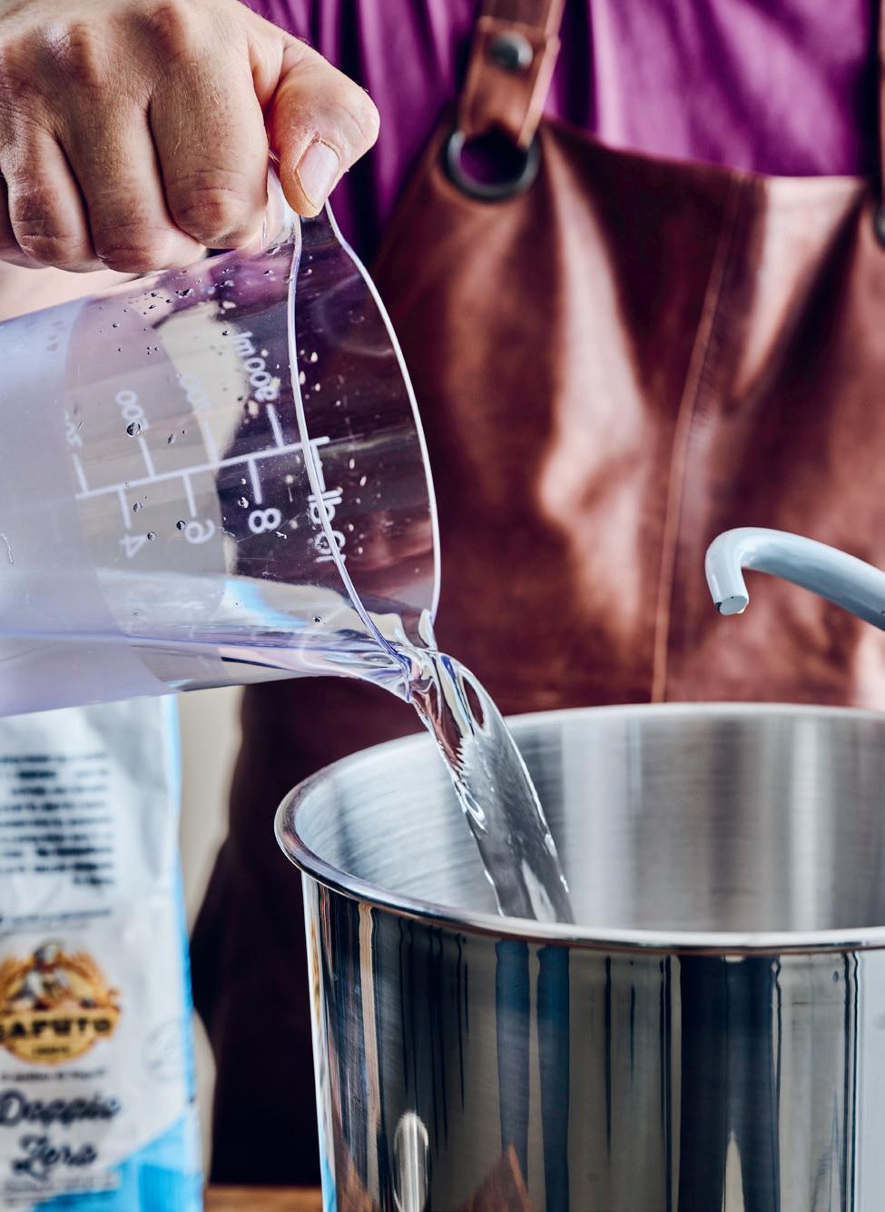 Vannet skal være iskaldt og holde rundt 3–5 grader. Grunnen til dette er at deigen ikke skal bli for varm under eltingen. Den ferdige deigen skal ligge mellom 20 og 24 grader. Når vi elter i en vanlig kjøkkenmaskin, vil deigen øke nærmere 1 grad per minutt. Blir den ferdige deigen for varm, vil vi få en ukontrollert gjæring. Med oppgitt temperatur på vannet vil deigen ende på mellom 20 og 24 grader om man bruker et romtemperert mel.