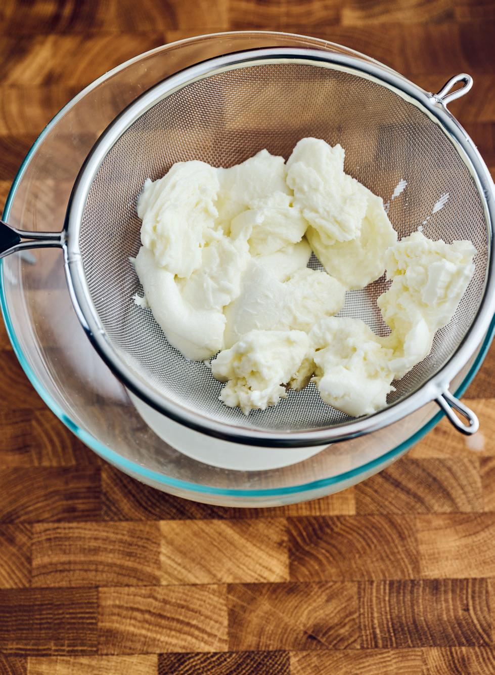Vi begynner med å tømme vannet fra mozzarellakulen. Så skjærer vi dem først i skiver for så å skjære dem på tvers igjen. De skal skjæres til som litt avlange kubber. Denne formen for oppdeling kalles for Julienne. Ha de oppskårne ostebitene i en sil som plasseres over en skål. Dekk med plast og sett i kjøleskapet, slik at osten får rent av seg. La den stå i minst to timer, men gjerne 5–6 timer eller lenger om du har mulighet.