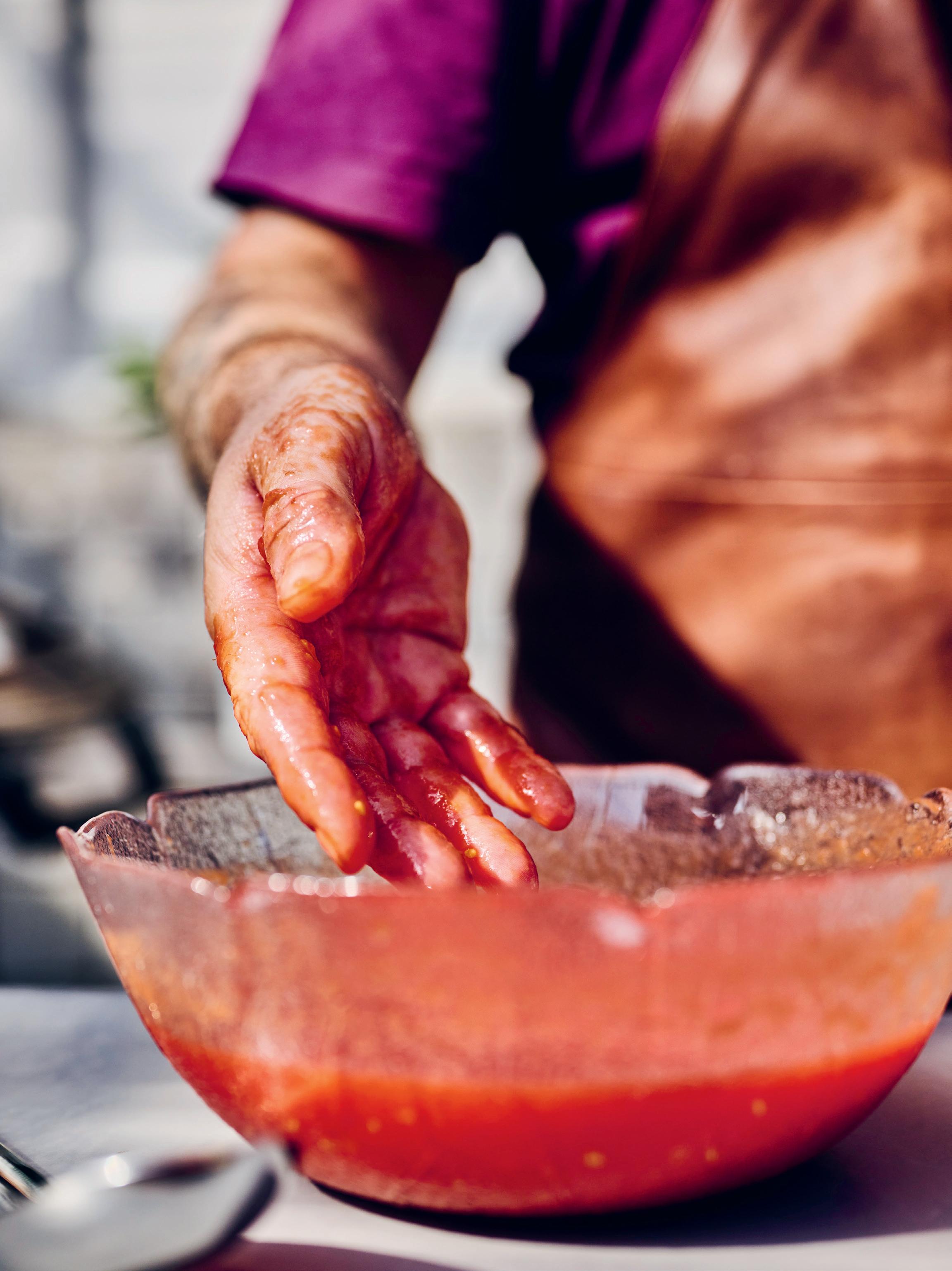 Tomatsausen er av den enkle typen og skal ikke kokes. Hell de hermetiske tomatene over i en skål, og kjør dem noen lette støt med en stavmikser. Ikke kjør for mye slik at frøene i tomatene blir most. Om du gjør det, vil sausen bli i overkant syrlig og bitter. Ha den moste tomatmassen over i en finmasket sil og la den renne av seg. Smak så til med salt og eventuelt sukker om sausen er litt syrlig.