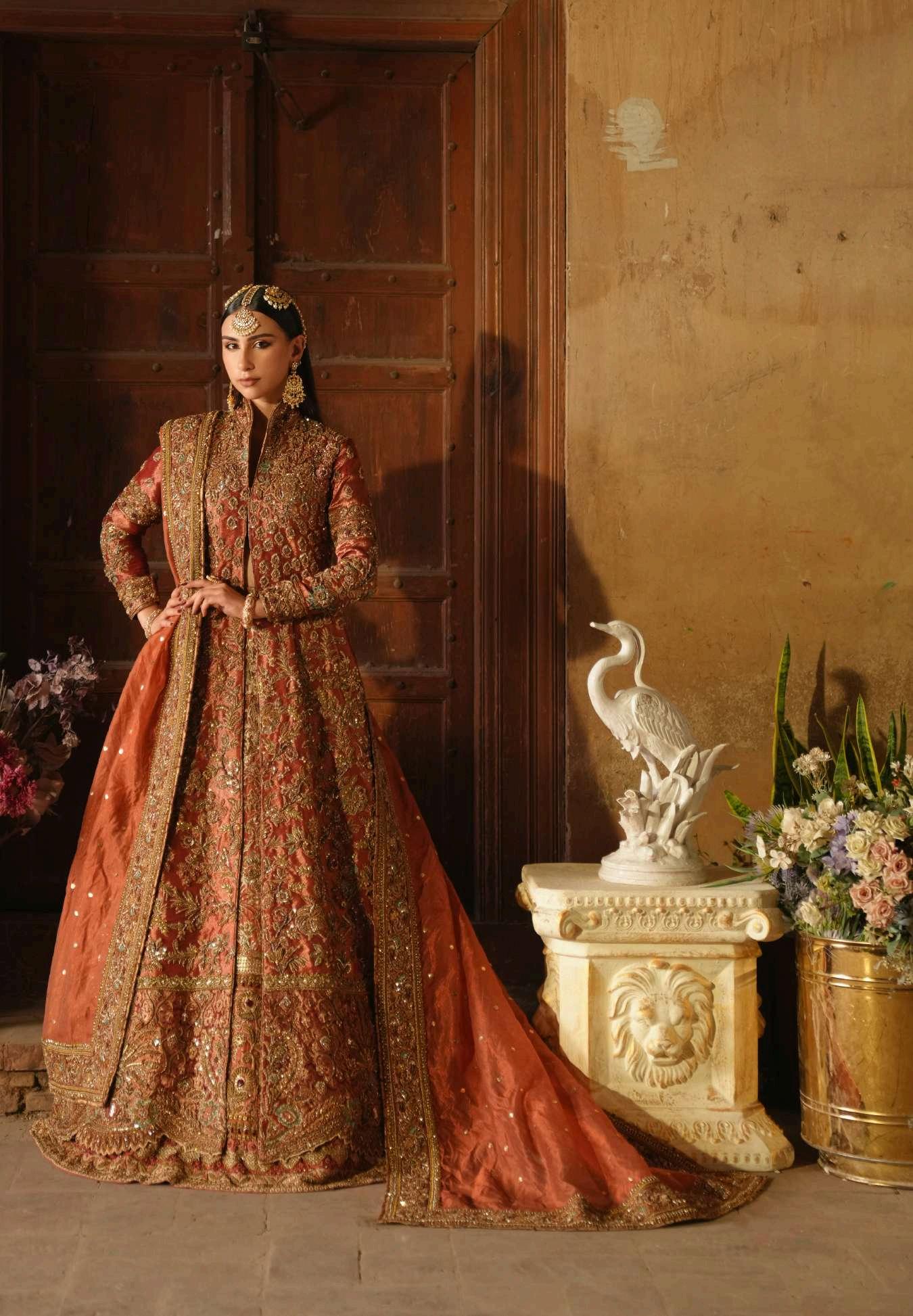 Side-swept waves by Hifsa Khan offer a romantic, glamorous look for reception brides With voluminous waves swept to one side, this style adds vintage charm while enhancing the bride's natural beauty Classic red and traditional bridals by Bunto Kazmi showcase gold and orange hues, featuring rich embroidery, intricate beadwork, and goldthread embellishme nts, reflecting South Asian cultural elegance.