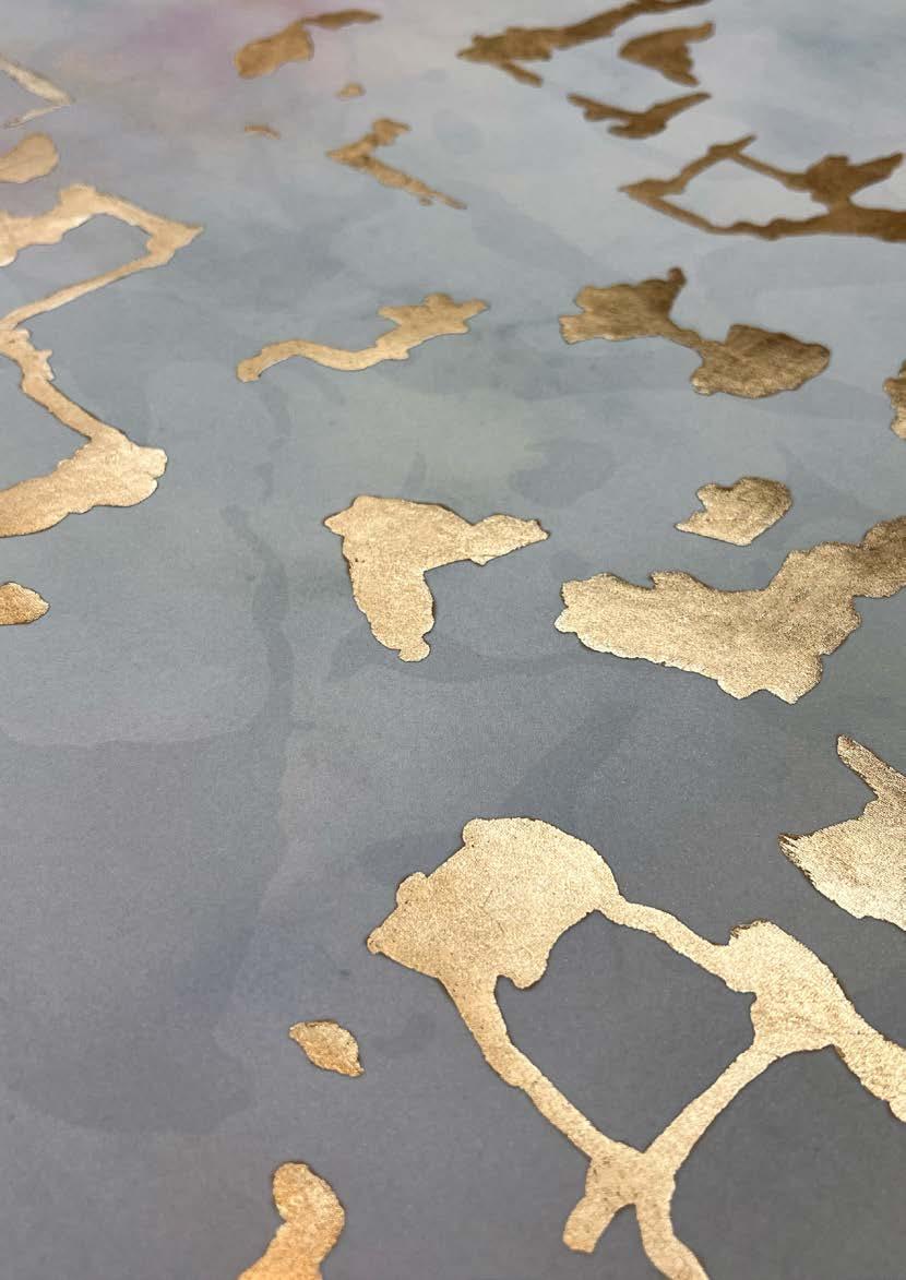Washes of iridescent metallic paints are layered and brushed across silk grounds. The interplay of loose, gestural painting techniques results in an effortless design that is both understated and utterly mesmerising.