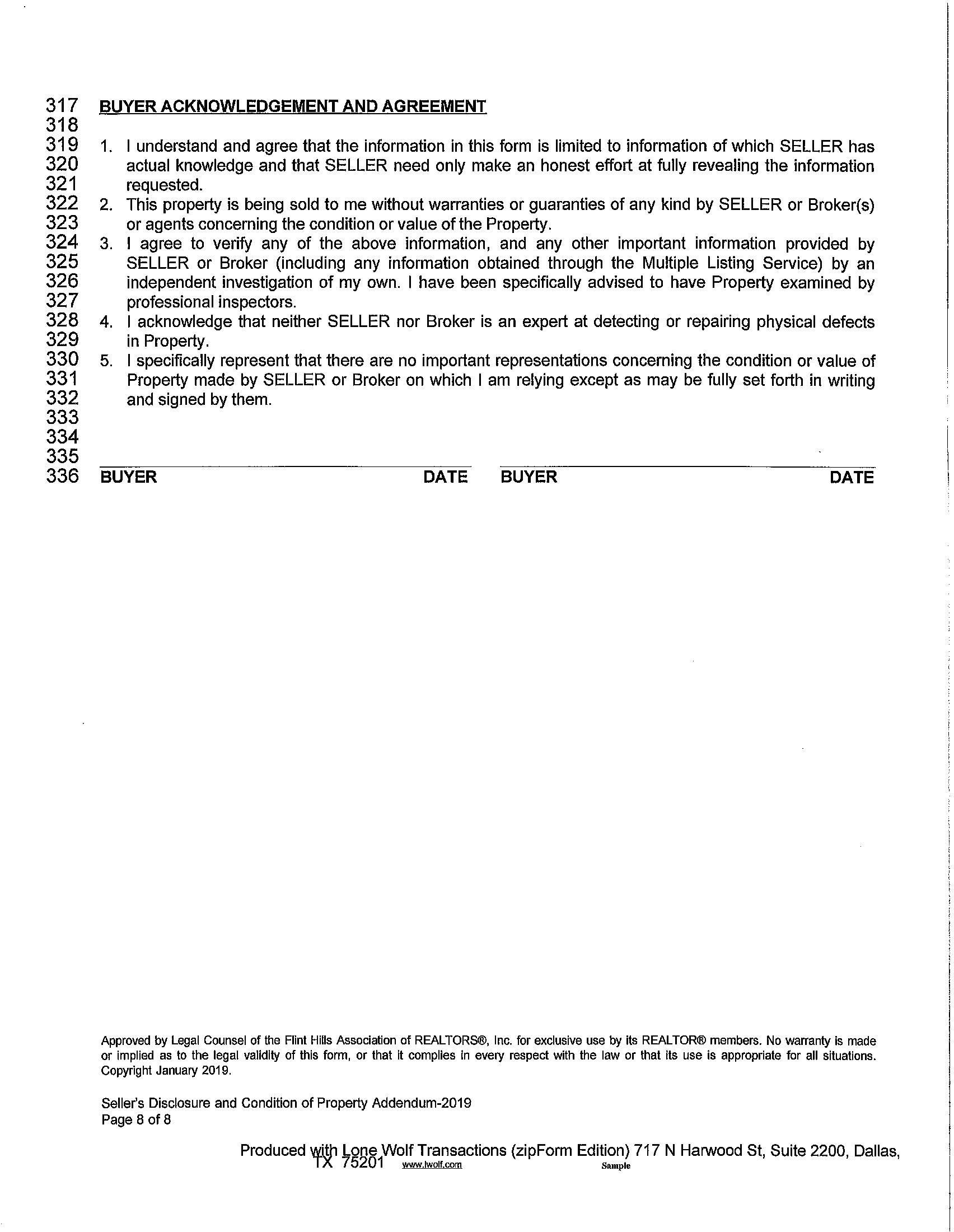 322 2. This property is being soldto me without warranties or guarantiesofanykind by SELLER or Broker(s) 323 or agents concerning the condition or valueofthe Property.