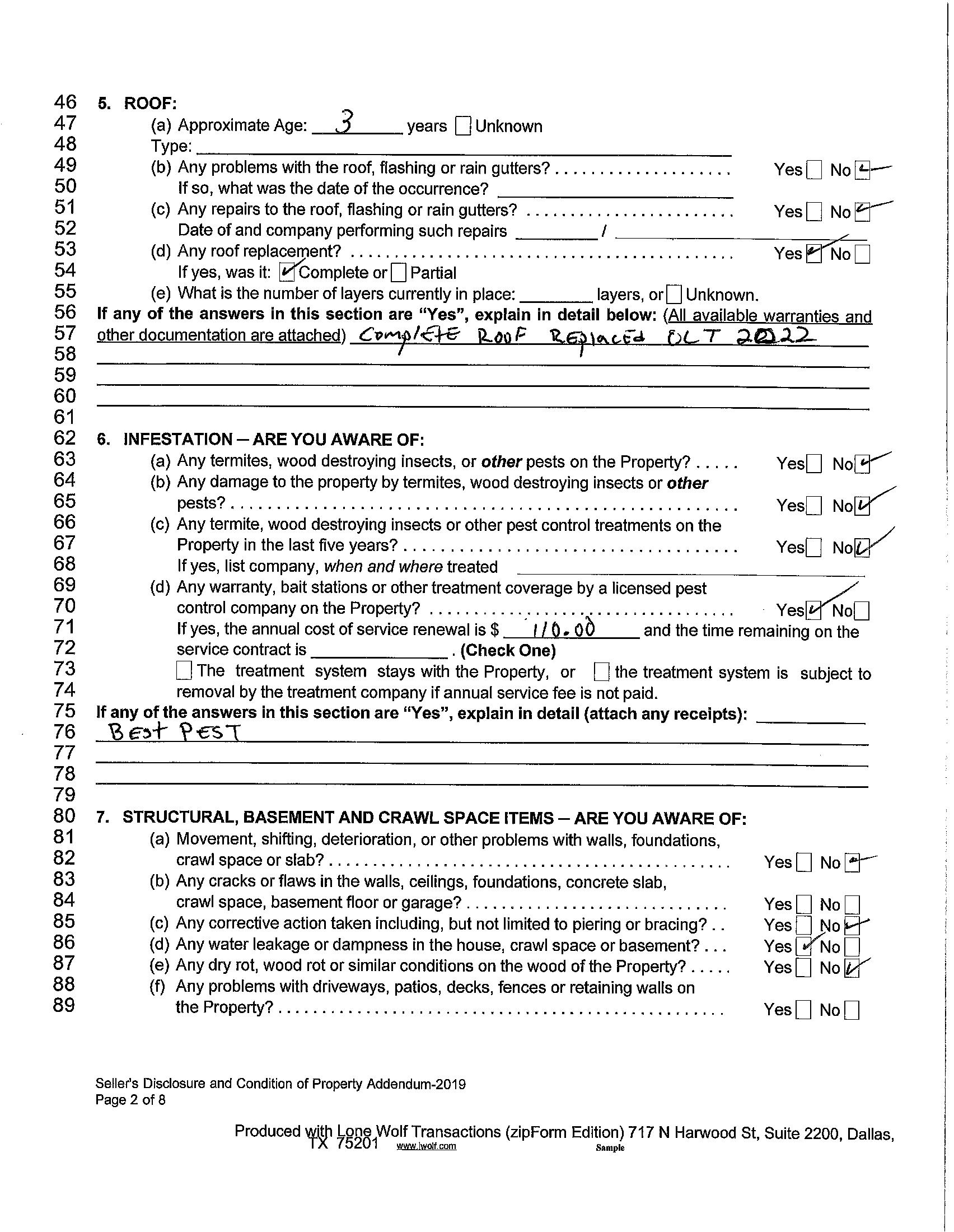(c) Any termite, wood destroying insects or other pest control treatments on the Property in the last five years?