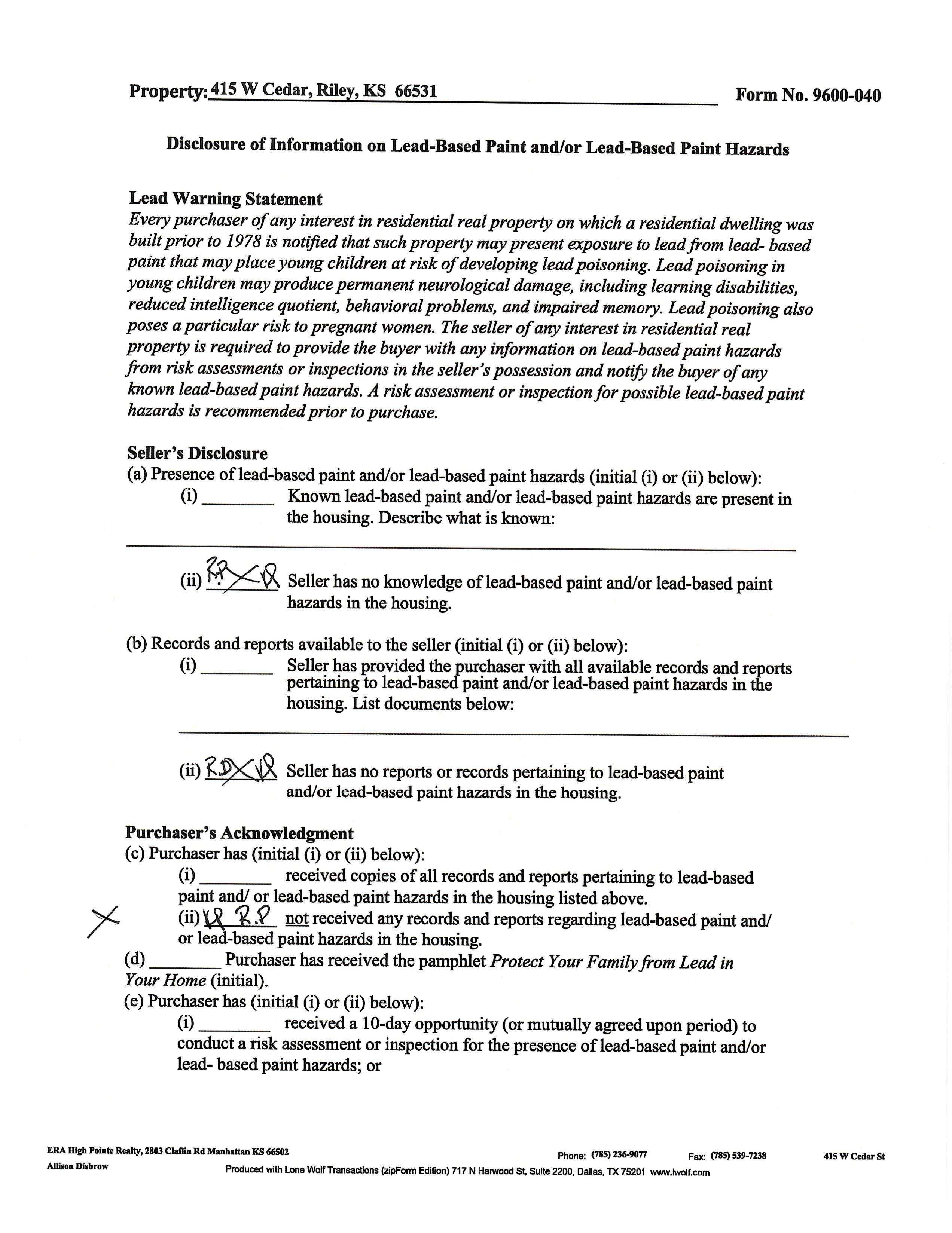 (i) Seller has provided the purchaser with all available records and reports pertaining to lead-based paint and/or lead-based paint hazards in the housing. List documents below: