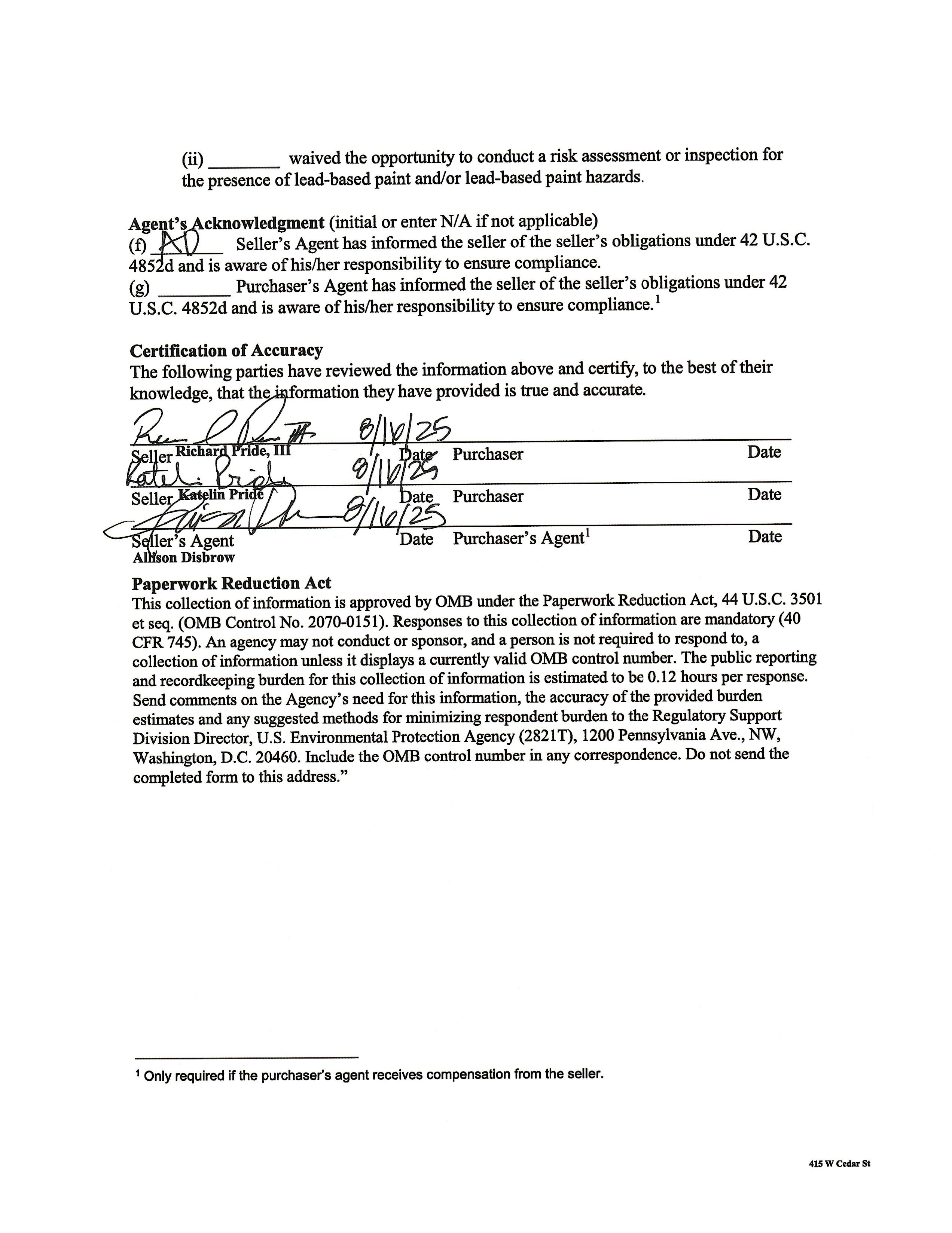 (D Seller's Agenthas informed the sellerof the seller's obligations under42 U.S.C. 4852d and is aware of his/her responsibility to ensure compliance. (g) Purchaser's Agent has informed the seller ofthe seller's obligations under 42 U.S.C. 4852d and is aware of his/her responsibility to ensure compliance.¹