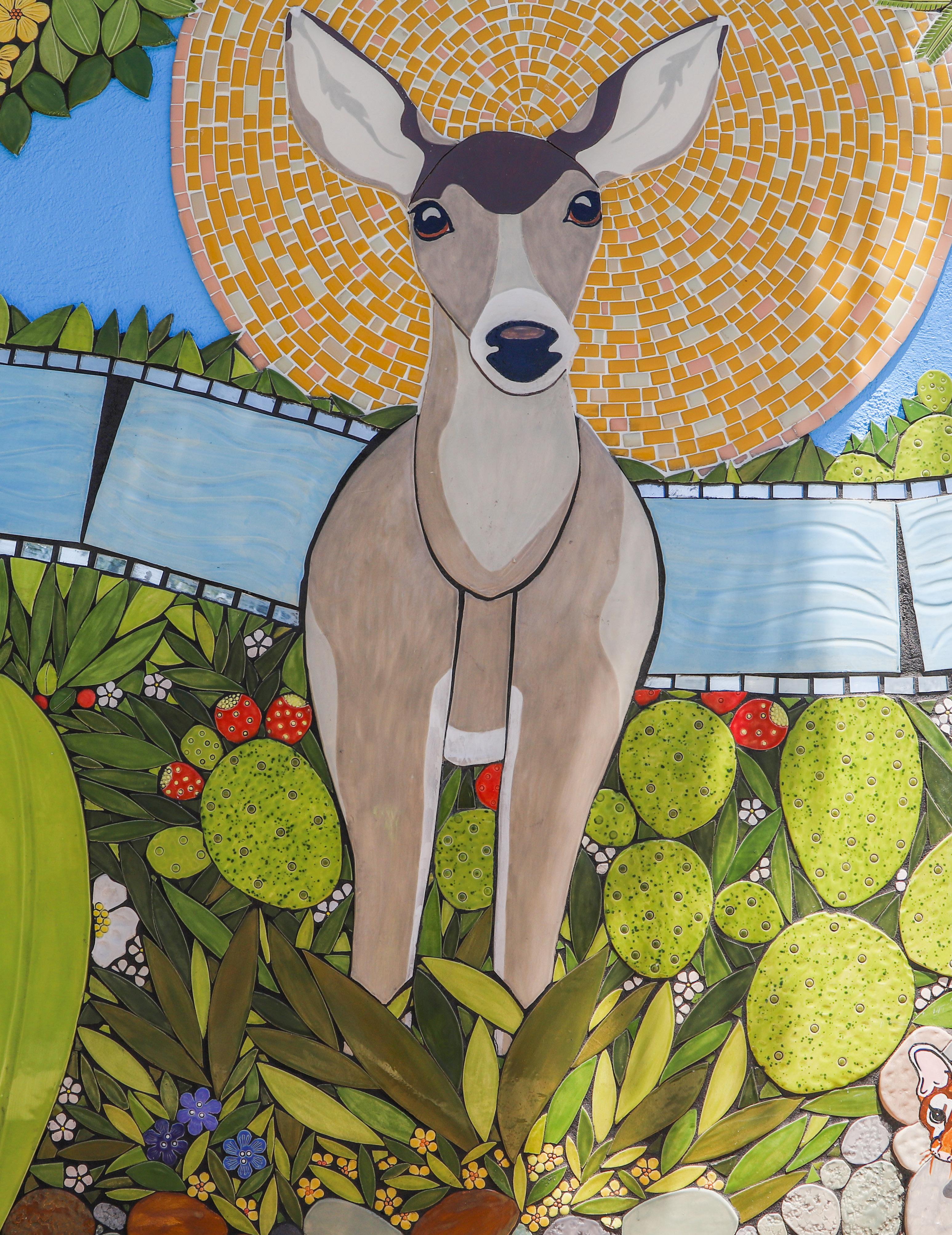 “The Desert’s Garden” by Arizona-based artist Tammi Lynch-Forrest melds thousands of handmade mosaic tiles illustrating the plants and charming animals that make up Scottsdale’s terrain. Spread over 40 feet, the mosaic represents the flow of time, depicting three eras of the land through the plants and animals present. Visitors can spy olive and desert ironwood trees, poppies, monarch butterflies, yucca and more throughout the mosaic. The piece was commissioned for the Scottsdale Civic Center’s 2021-23 renovation project and resides on the southwest corner of Scottsdale City Hall.