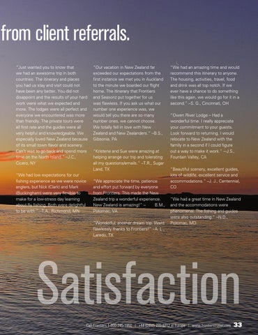 from client referrals. “Just wanted you to know that we had an awesome trip in both countries. The itinerary and places you had us stay and visit could not have been any better. You did not disappoint and the results of your hard work were what we expected and more. The lodges were all perfect and everyone we encountered was more than friendly. The private tours were all first rate and the guides were all very helpful and knowledgeable. We especially loved New Zealand because of its small town flavor and scenery. Can’t wait to go back and spend more time on the North Island.” –J.C., Cicero, NY “We had low expectations for our fishing experience as we were novice anglers, but Nick (Clark) and Mark (Buckingham) were very flexible to make for a low-stress day learning about fly fishing. Both were delightful to be with.” –T.A., Richmond, MN