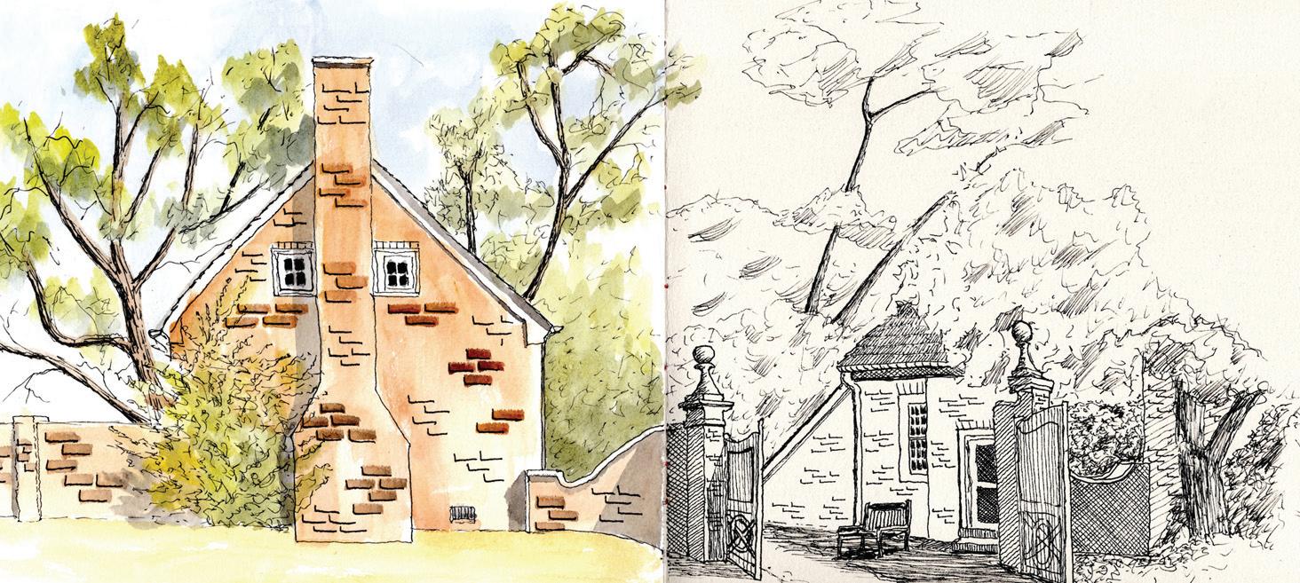 Hi everyone and happy October! It has been perfect weather for sketching outdoors, and I've been looking forward to using a new sketchbook I recently I made in a bookbinding workshop with Elizabeth Seaver at Libertytown Arts Workshop. I bound various sheets of paper that I'd had since the days when I was doing calligraphy and I was no longer sure exactly what any of it was. That means when I sketch on it I won't know ahead of time how it will react to ink or watercolor. On the book's maiden voyage, I joined other urban sketchers at Chatham Manor and created a drawing across a two-page spread. Both pages took the ink well but when it came time to add the watercolor, I balked and decided to finish the right side in ink alone. I like the larger format and I'm looking forward to using it more. There's still a lot of good weather to come, so why not join us? You can find us on Facebook at Urban Sketchers Fredericksburg. Paula Raudenbush is the founder of the local chapter of the Urban Sketchers International. She shows her work at Libertytown Arts Workshop