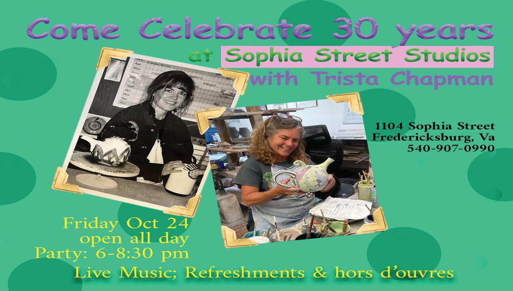 The 1995 Arts in the Park show was also where Trista met her husband-to-be, Phil Chapman Phil had been a production rake potter in Fredericksburg since 1977, and opened his Sophia Street Studios workshop in 1982 They married in 1998 and did about 30 national juried art shows a year until 2005, when illness forced Phil to stop working. Phil passed away in 2008, and Trista has continued doing shows and maintaining the studio tradition of selling fine art and handcrafts.