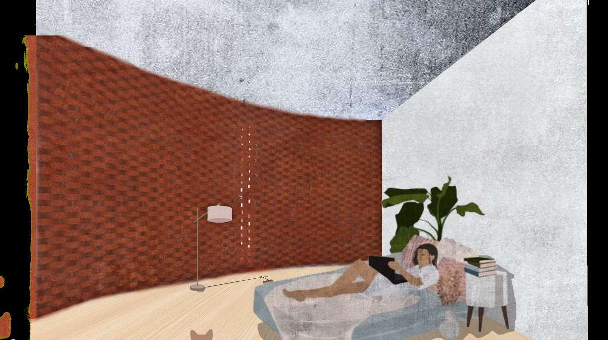 Le défi de ce projet était l’adaptation a la topographie de site, mais plus que cela il faut respecter la réglementation et songer au bien être des habitants dans notre démarche. La villa B³ tient son nom des matériaux majeurs de sa construction : Béton, Bois, et Brique. J’ai opté pour des Matériaux dans leur forme brute, parce que les textures affectent nos sensés et donc permettent de renforcer l’expérience spatiale du bâtiment, surtout la brique que j’ai choisi appliquer dans les éléments clé du projet : le Mur paramétrique en brique et les secondes peaux qui rappelle son effet dans différentes parties.