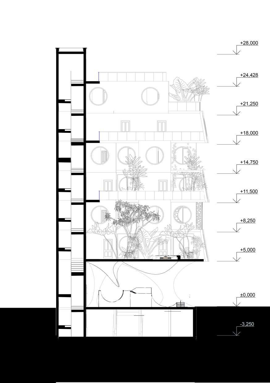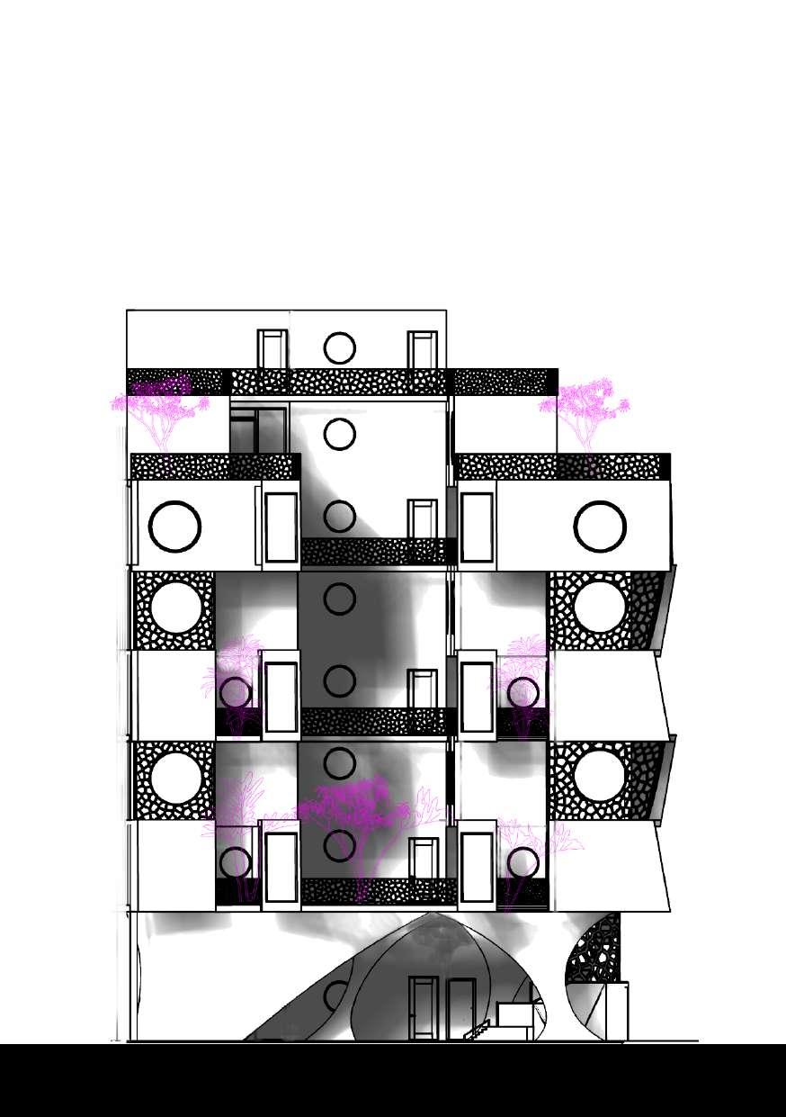 Afin de fluidifier la circulation au sein du bâtiment, d’assurer plus au moins une égalité de superficie entre appartements, plus d’accès vers la lumière de jour et ventilation naturelle, et une longue vue sur le jardin et le foyer du premier étage, j’ai opté pour des duplexes, chacun avec son propre Terrasse-jardin de 6 m d’hauteur et des couloirs libres du côté cour et qui se répètent chaque 2 niveaux pour assurer l’intimité des habitants.