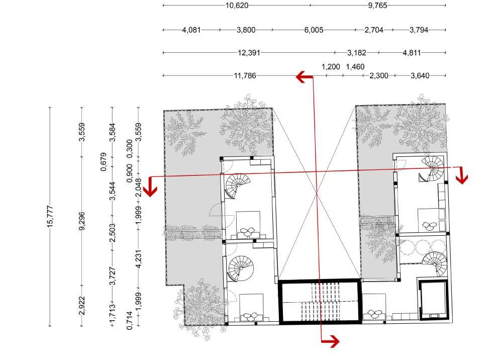Le plan du premier étage se répète dans le 3eme étage (mais sans jardin) on peut voir comment l’espace de circulation s’ouvre sur deux couloirs permettant l’accès vers les duplexes et au jardin et le foyer extérieur de feu.