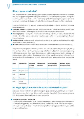 Kiedy upowszechniaç? Plan upowszechniania produktów projektu i zachodzàcych w jego trakcie procesów powinien braç pod uwag´ poszczególne fazy projektu. OczywiÊcie nale˝y za∏o˝yç elastycznoÊç ze wzgl´du na zmiany, jakie mogà zajÊç w wyniku realizacji projektu. Utworzenie planu upowszechniania na samym poczàtku projektu pozwoli jednak˝e na w∏aÊciwà alokacj´ Êrodków w bud˝ecie. Upowszechnianie trwa przez ca∏y okres realizacji projektu. Mo˝na wyró˝niç jego trzy podstawowe fazy: r poczàtek projektu – upewnienie si´, ˝e planowane cele upowszechniania produktów/ rezultatów, metody i Êrodki sà dostosowane do w∏aÊciwych grup docelowych; r trwanie projektu – wyciàganie doÊwiadczeƒ z realizacji projektu, w razie potrzeby zmiana metod i Êrodków upowszechniania rezultatów/produktów w poszczególnych fazach przedsi´wzi´cia; r koniec projektu – podsumowanie osiàgni´tych rezultatów/produktów, doÊwiadczeƒ, korzyÊci wynikajàcych z realizacji projektu; r co dalej? – wykorzystanie rezultatów po zakoƒczeniu finansowania ze Êrodków europejskich. Przypominamy, ˝e upowszechnianie powinno byç przedstawione jako proces ciàg∏y, który trwa podczas ca∏ego projektu, a tak˝e po jego zakoƒczeniu. Dzia∏ania promocyjne powinny byç integralnà cz´Êcià planu pracy. Zaleca si´, aby ka˝dy etap projektu (pakiet roboczy) by∏ podsumowany odpowiednim do osiàgni´tych wyników przedsi´wzi´ciem informacyjnym i promocyjnym. Przy planowaniu strategii upowszechniania warto pos∏u˝yç si´ nast´pujàcà tabelà: Grupa docelowa upowszechniania