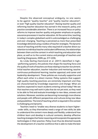 Despite the observed conceptual ambiguity, no one seems to be against "quality teacher" and "quality teacher education", or even "high quality teacher education". Raising teacher quality and reforming teacher education has earned in the research, policy, and practice considerable attention. There is an increased focus on policy reforms to improve teacher quality and greater emphasis on quality assurance processes in teacher education. At the same time, teaching in today’s complex globalised world is acknowledged as challenging and ever-changing. Teaching is perceived as more than prescribed knowledge delivered using a toolbox of teacher strategies. The dynamic nature of teaching and the many roles required of a teacher direct our attention to individual teacher and student differences, the relationships between them and the context in which teaching and education take place, as well as to the current status and prestige of teachers and teaching (Hargreaves, 2009, pp. 217–229).