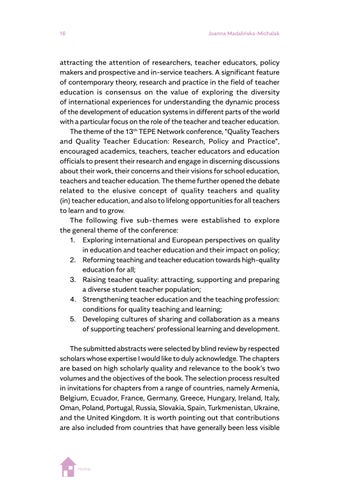 a highlighted relevance for post-pandemic societies, which can be seen in Wanda Dróżka’s chapter on teacher values and Anna Krzyżanowska’s on outdoor learning experiences. Some contributions highlight research findings that direct our attention to issues that will need to be reconsidered in the era of post-pandemic teacher education and societies, such as teacher wellbeing, gender and job satisfaction (Suzanne O’Keeffe), new kinds of physical spaces as learning environments (Louise Campbell), teacher candidates’ profiles and competences (Magdalena Jelonek, Barbara Worek and Marcin Kocór), teachers’ sense of readiness about research inquiry (Maria Antonietta Impedovo), teacher identity (Eugenia Tsiouplis and Dimitrios Stamovlasis), teaching quality assurance (Nataliya Avshenyuk and Nataliya Seminikhyna), and promoting quality through teaching and learning (Melanie Ellis, Martina Šipošová, Jenny Johana