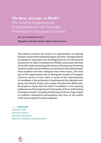 Table of Contents 9 Acknowledgements 10 Introduction Quality Teachers and Quality In-service Teacher Education Joanna Madalińska-Michalak 18 The Best, Average, or Weak? The Level of Competencies of Candidates for the Teaching Profession in European Countries Magdalena Jelonek, Barbara Worek, Marcin Kocór 42 Quality Teachers and Quality Teacher Education Exploring Wellbeing, Gender and Job Satisfaction Suzanne O’Keeffe 58 Generational Differences and Professional Values of Teachers Wanda Dróżka