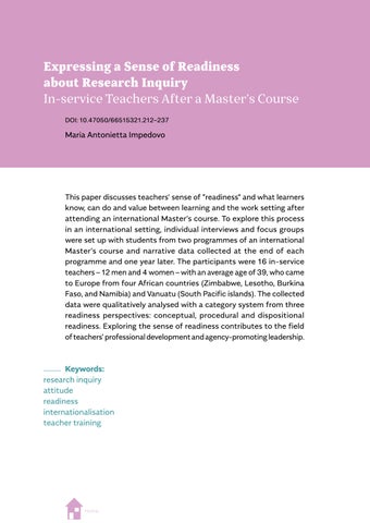 a highlighted relevance for post-pandemic societies, which can be seen in Wanda Dróżka’s chapter on teacher values and Anna Krzyżanowska’s on outdoor learning experiences. Some contributions highlight research findings that direct our attention to issues that will need to be reconsidered in the era of post-pandemic teacher education and societies, such as teacher wellbeing, gender and job satisfaction (Suzanne O’Keeffe), new kinds of physical spaces as learning environments (Louise Campbell), teacher candidates’ profiles and competences (Magdalena Jelonek, Barbara Worek and Marcin Kocór), teachers’ sense of readiness about research inquiry (Maria Antonietta Impedovo), teacher identity (Eugenia Tsiouplis and Dimitrios Stamovlasis), teaching quality assurance (Nataliya Avshenyuk and Nataliya Seminikhyna), and promoting quality through teaching and learning (Melanie Ellis, Martina Šipošová, Jenny Johana