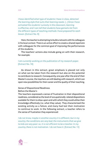 a highlighted relevance for post-pandemic societies, which can be seen in Wanda Dróżka’s chapter on teacher values and Anna Krzyżanowska’s on outdoor learning experiences. Some contributions highlight research findings that direct our attention to issues that will need to be reconsidered in the era of post-pandemic teacher education and societies, such as teacher wellbeing, gender and job satisfaction (Suzanne O’Keeffe), new kinds of physical spaces as learning environments (Louise Campbell), teacher candidates’ profiles and competences (Magdalena Jelonek, Barbara Worek and Marcin Kocór), teachers’ sense of readiness about research inquiry (Maria Antonietta Impedovo), teacher identity (Eugenia Tsiouplis and Dimitrios Stamovlasis), teaching quality assurance (Nataliya Avshenyuk and Nataliya Seminikhyna), and promoting quality through teaching and learning (Melanie Ellis, Martina Šipošová, Jenny Johana