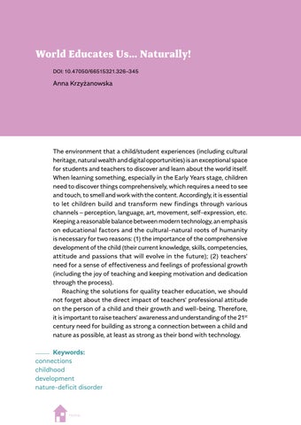 a highlighted relevance for post-pandemic societies, which can be seen in Wanda Dróżka’s chapter on teacher values and Anna Krzyżanowska’s on outdoor learning experiences. Some contributions highlight research findings that direct our attention to issues that will need to be reconsidered in the era of post-pandemic teacher education and societies, such as teacher wellbeing, gender and job satisfaction (Suzanne O’Keeffe), new kinds of physical spaces as learning environments (Louise Campbell), teacher candidates’ profiles and competences (Magdalena Jelonek, Barbara Worek and Marcin Kocór), teachers’ sense of readiness about research inquiry (Maria Antonietta Impedovo), teacher identity (Eugenia Tsiouplis and Dimitrios Stamovlasis), teaching quality assurance (Nataliya Avshenyuk and Nataliya Seminikhyna), and promoting quality through teaching and learning (Melanie Ellis, Martina Šipošová, Jenny Johana