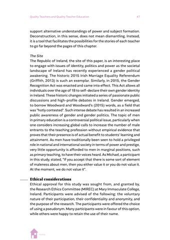 a highlighted relevance for post-pandemic societies, which can be seen in Wanda Dróżka’s chapter on teacher values and Anna Krzyżanowska’s on outdoor learning experiences. Some contributions highlight research findings that direct our attention to issues that will need to be reconsidered in the era of post-pandemic teacher education and societies, such as teacher wellbeing, gender and job satisfaction (Suzanne O’Keeffe), new kinds of physical spaces as learning environments (Louise Campbell), teacher candidates’ profiles and competences (Magdalena Jelonek, Barbara Worek and Marcin Kocór), teachers’ sense of readiness about research inquiry (Maria Antonietta Impedovo), teacher identity (Eugenia Tsiouplis and Dimitrios Stamovlasis), teaching quality assurance (Nataliya Avshenyuk and Nataliya Seminikhyna), and promoting quality through teaching and learning (Melanie Ellis, Martina Šipošová, Jenny Johana