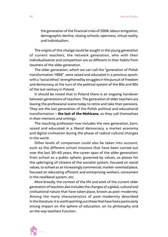 a highlighted relevance for post-pandemic societies, which can be seen in Wanda Dróżka’s chapter on teacher values and Anna Krzyżanowska’s on outdoor learning experiences. Some contributions highlight research findings that direct our attention to issues that will need to be reconsidered in the era of post-pandemic teacher education and societies, such as teacher wellbeing, gender and job satisfaction (Suzanne O’Keeffe), new kinds of physical spaces as learning environments (Louise Campbell), teacher candidates’ profiles and competences (Magdalena Jelonek, Barbara Worek and Marcin Kocór), teachers’ sense of readiness about research inquiry (Maria Antonietta Impedovo), teacher identity (Eugenia Tsiouplis and Dimitrios Stamovlasis), teaching quality assurance (Nataliya Avshenyuk and Nataliya Seminikhyna), and promoting quality through teaching and learning (Melanie Ellis, Martina Šipošová, Jenny Johana