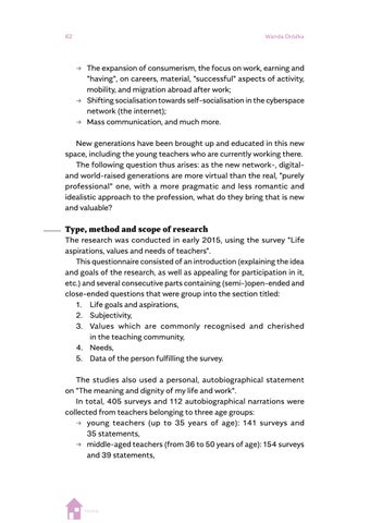 a highlighted relevance for post-pandemic societies, which can be seen in Wanda Dróżka’s chapter on teacher values and Anna Krzyżanowska’s on outdoor learning experiences. Some contributions highlight research findings that direct our attention to issues that will need to be reconsidered in the era of post-pandemic teacher education and societies, such as teacher wellbeing, gender and job satisfaction (Suzanne O’Keeffe), new kinds of physical spaces as learning environments (Louise Campbell), teacher candidates’ profiles and competences (Magdalena Jelonek, Barbara Worek and Marcin Kocór), teachers’ sense of readiness about research inquiry (Maria Antonietta Impedovo), teacher identity (Eugenia Tsiouplis and Dimitrios Stamovlasis), teaching quality assurance (Nataliya Avshenyuk and Nataliya Seminikhyna), and promoting quality through teaching and learning (Melanie Ellis, Martina Šipošová, Jenny Johana