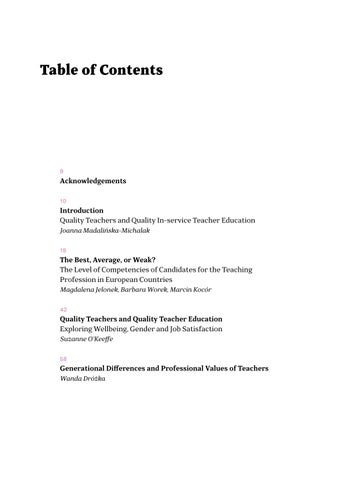 Table of Contents 9 Acknowledgements 10 Introduction Quality Teachers and Quality In-service Teacher Education Joanna Madalińska-Michalak 18 The Best, Average, or Weak? The Level of Competencies of Candidates for the Teaching Profession in European Countries Magdalena Jelonek, Barbara Worek, Marcin Kocór 42 Quality Teachers and Quality Teacher Education Exploring Wellbeing, Gender and Job Satisfaction Suzanne O’Keeffe 58 Generational Differences and Professional Values of Teachers Wanda Dróżka