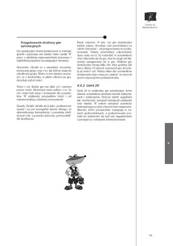 Ramy czasowe: O tym, czy gra symulacyjna b´dzie udana, decyduje czas przewidziany na ca∏oÊç çwiczenia – od przygotowania do podsumowania. Nale˝y przewidzieç odpowiednio du˝o czasu na to, by rozbudziç w uczestnikach ch´ç w∏àczenia si´ do gry oraz by mogli oni faktycznie zaanga˝owaç si´ w gr´. Niektóre gry symulacyjne trwajà kilka dni, inne godzin´ lub nieco d∏u˝ej. O ramach czasowych gry decydujà jej treÊci i cel. Nale˝y tak˝e daç uczestnikom dostatecznie du˝o czasu na „wyjÊcie” ze swej roli przed rozpocz´ciem podsumowania.