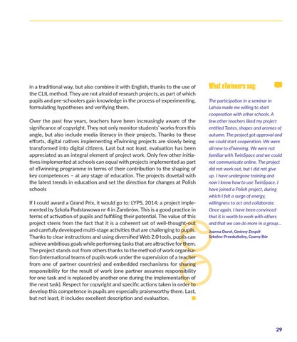 in a traditional way, but also combine it with English, thanks to the use of the CLIL method. They are not afraid of research projects, as part of which pupils and pre-schoolers gain knowledge in the process of experimenting, formulating hypotheses and verifying them. Over the past few years, teachers have been increasingly aware of the significance of copyright. They not only monitor students’ works from this angle, but also include media literacy in their projects. Thanks to these efforts, digital natives implementing eTwinning projects are slowly being transformed into digital citizens. Last but not least, evaluation has been appreciated as an integral element of project work. Only few other initiatives implemented at schools can equal with projects implemented as part of eTwinning programme in terms of their contribution to the shaping of key competences – at any stage of education. The projects dovetail with the latest trends in education and set the direction for changes at Polish schools If I could award a Grand Prix, it would go to: LYPS, 2014; a project implemented by Szkoła Podstawowa nr 4 in Zambrów. This is a good practice in terms of activation of pupils and fulfilling their potential. The value of this project stems from the fact that it is a coherent set of well-thought-out and carefully developed multi-stage activities that are challenging to pupils. Thanks to clear instructions and using diversified Web 2.0 tools, pupils can achieve ambitious goals while performing tasks that are attractive for them. The project stands out from others thanks to the method of work organisation (international teams of pupils work under the supervision of a teacher from one of partner countries) and embedded mechanisms for sharing responsibility for the result of work (one partner assumes responsibility for one task and is replaced by another one during the implementation of the next task). Respect for copyright and specific actions taken in order to develop this competence in pupils are especially praiseworthy there. Last, but not least, it includes excellent description and evaluation. ■