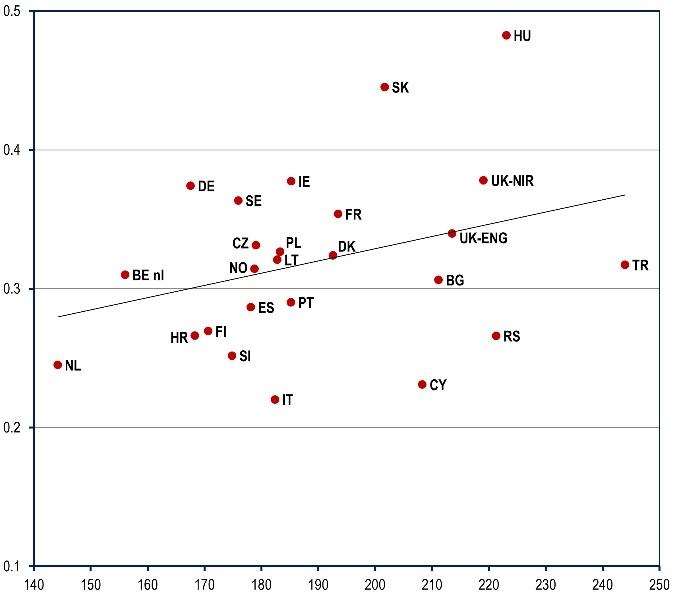 Rysunek I.2.2: Różnice w osiągnięciach pomiędzy uczniami o dobrych (P90) a tymi o słabych (P10) wynikach w nauce (w porządku rosnącym) oraz odsetek uczniów osiągających słabe wyniki w matematyce w klasie czwartej, 2015