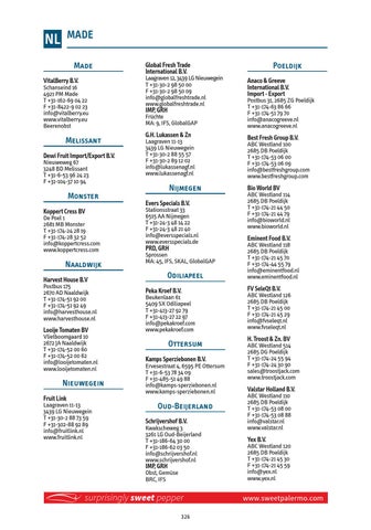 Bio World BV ABC Westland 114 2685 DB Poeldijk T +31-174-21 44 50 F +31-174-21 44 79 info@bioworld.nl www.bioworld.nl Eminent Food B.V. ABC Westland 118 2685 DB Poeldijk T +31-174-21 45 70 F +31-174-44 55 79 info@eminentfood.nl www.eminentfood.nl FV SeleQt B.V. ABC Westland 126 2685 DB Poeldijk T +31-174-21 45 00 F +31-174-21 45 29 info@fvseleqt.nl www.fvseleqt.nl H. Troost & Zn. BV ABC Westland 514 2685 DG Poeldijk T +31-174-24 55 94 F +31-174-24 30 90 sales@troostjack.com www.troostjack.com Valstar Holland B.V. ABC Westland 110 2685 DB Poeldijk T +31-174-53 08 00 F +31-174-53 08 88 info@valstar.nl www.valstar.nl Yex B.V. ABC Westland 120 2685 DB Poeldijk T +31-174-21 45 30 F +31-174-21 45 59 info@yex.nl www.yex.nl