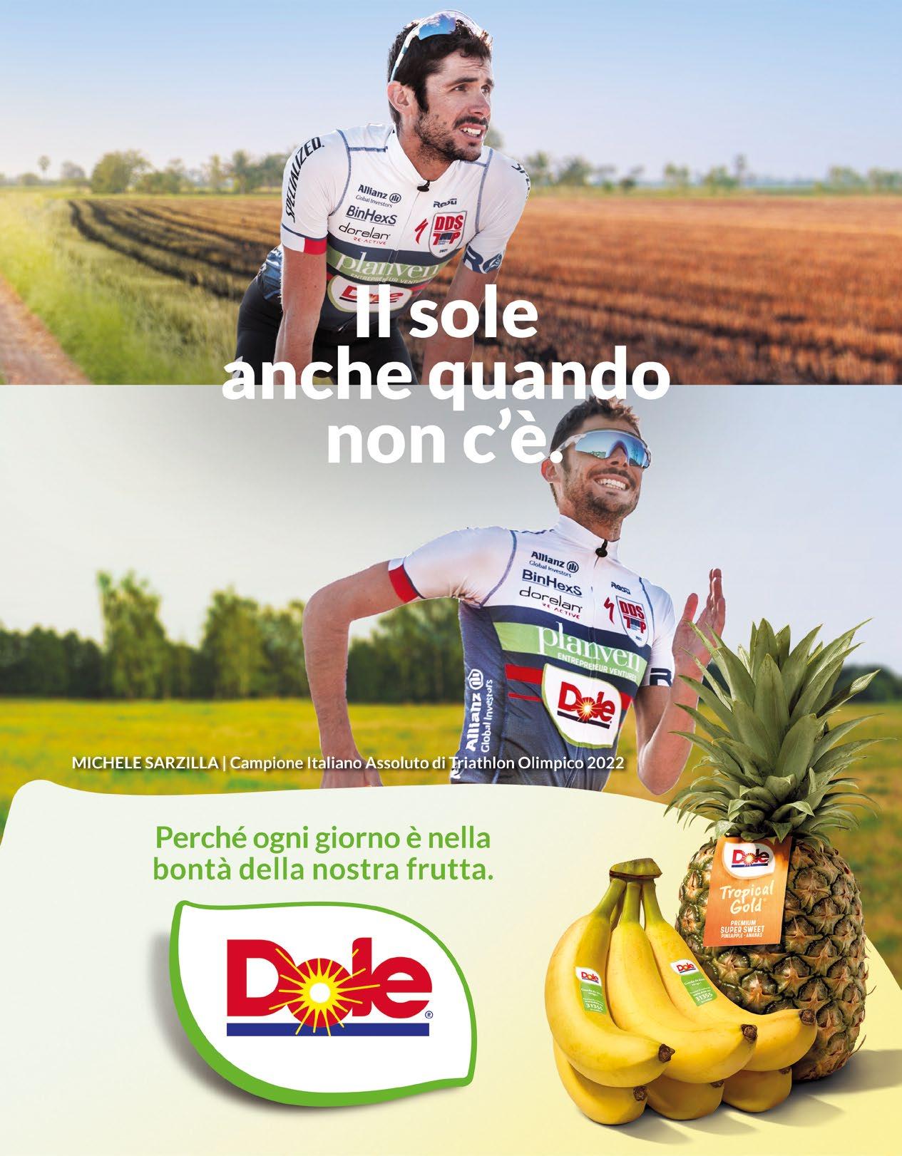 Quest’anno la campagna di comunicazione di Dole Italia - “Il sole anche quando non c’è” - si è rinnovata con un completo refresh dei soggetti coinvolti: i triatleti di successo, Bianca Seregni - medaglia di bronzo ai Mondiali Under 23 di Triathlon 2022 - e Michele Sarzilla - campione italiano assoluto di Triathlon Olimpico 2022 - sono i nuovi protagonisti insieme ai prodotti core-business di Dole Italia, le banane premium e l’ananas Dole.
