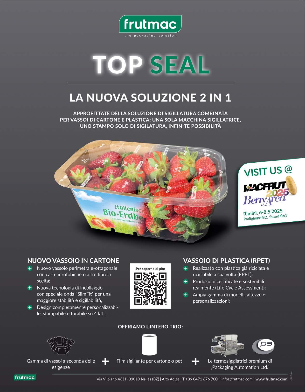 saldatrici all’avanguardia - capaci di lavorare fino a 180 confezioni al minuto - totalmente elettriche, a bassa manutenzione e ad altissima precisione. Il tutto abbinato a un’ampia gamma di soluzioni di packaging sostenibili: vaschette in PET riciclato o varianti in cartone con tecnologia SlimFit, tutte compatibili con lo stesso stampo di termosaldatura. Chi sceglie un partner solido trova in Frutmac un alleato esperto e innovativo per soluzioni di confezionamento sostenibili.