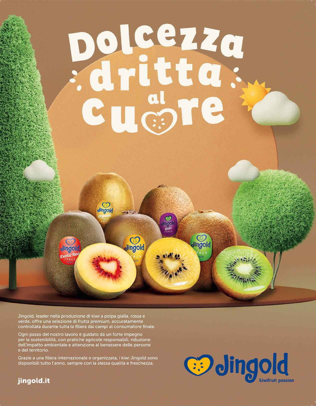 Un legame rafforzato anche dal colore giallo, cifra distintiva sia del personaggio SpongeBob sia di Jingold, che nasce nel 2001 proprio come specialista del kiwi a polpa gialla e su questo ha costruito la p r o p r i a i d e n t i t à i n t e r n a z i o n a l e Oggi l’innovativa azienda italiana - presente in tutto il mondo con una gamma completa di kiwi gialli, rossi, verdi e biologici - è pronta ad affrontare la nuova stagione produttiva e commerciale con ottimismo: si stima infatti un aumento di volumi nell’ordine del 20% per il kiwi a polpa gialla e una crescita del 10% anche per l’Exotic Red a polpa rossa.
