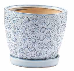 E 17843 6” White/Blue Embossed Daisy Planter with Saucer Ceramic