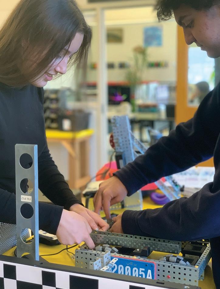 Robotics club teammates Anna Bondar ’23 and Aaron Zakon ’22 work on the main frame of their robot. the growth of robotics being employed across the U.S. and enterprises worldwide, the demand for a more specialized workforce to engineer and work in the field has also grown, leading to robotics study as early as elementary school and many new innovative learning systems
