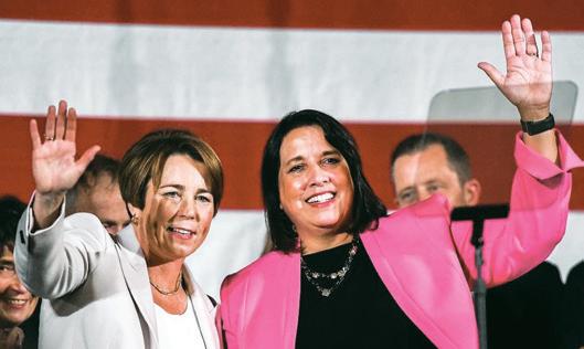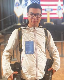 Julan Zhu ’21 shown here while covering the Massachusetts gubernatorial election this fall. Julian captured the newly elected governor of Massachusetts, Maura Healey, and Lieutenant Governor, Kim Driscoll, as they waved to the crowd during the celebration.