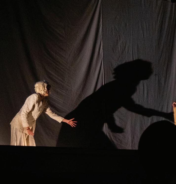 captivating scenery, including wing frescos and a fully mobile scene wagon; Emy Holden costumed and provided wigs for a cast exceeding 30 students (some costumes contributed by Patty Hibbert), and Ethan Swayze led the charge in collaborating with Emy Holden on the excellent light design and sound effects, which were ultimately executed by himself and an incredibly hard-working crew of student technicians.