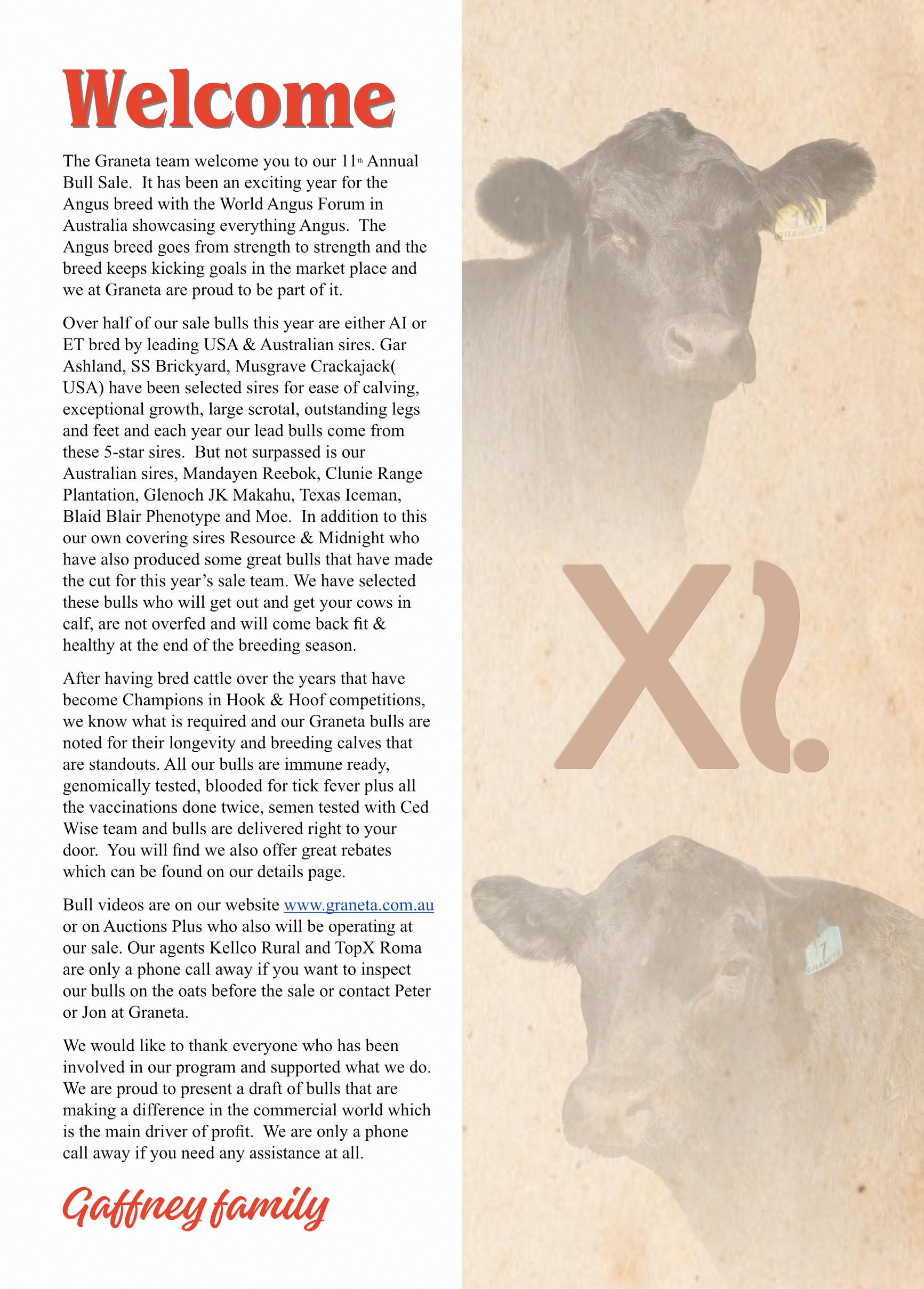Bull videos are on our website www.graneta.com.au, AuctionsPlus or StockLive who also will be operating at our sale. Our agents Kellco Rural and TopX Roma are only a phone call away if you want to inspect our bulls on the oats before the sale or contact Peter or Jon at Graneta.