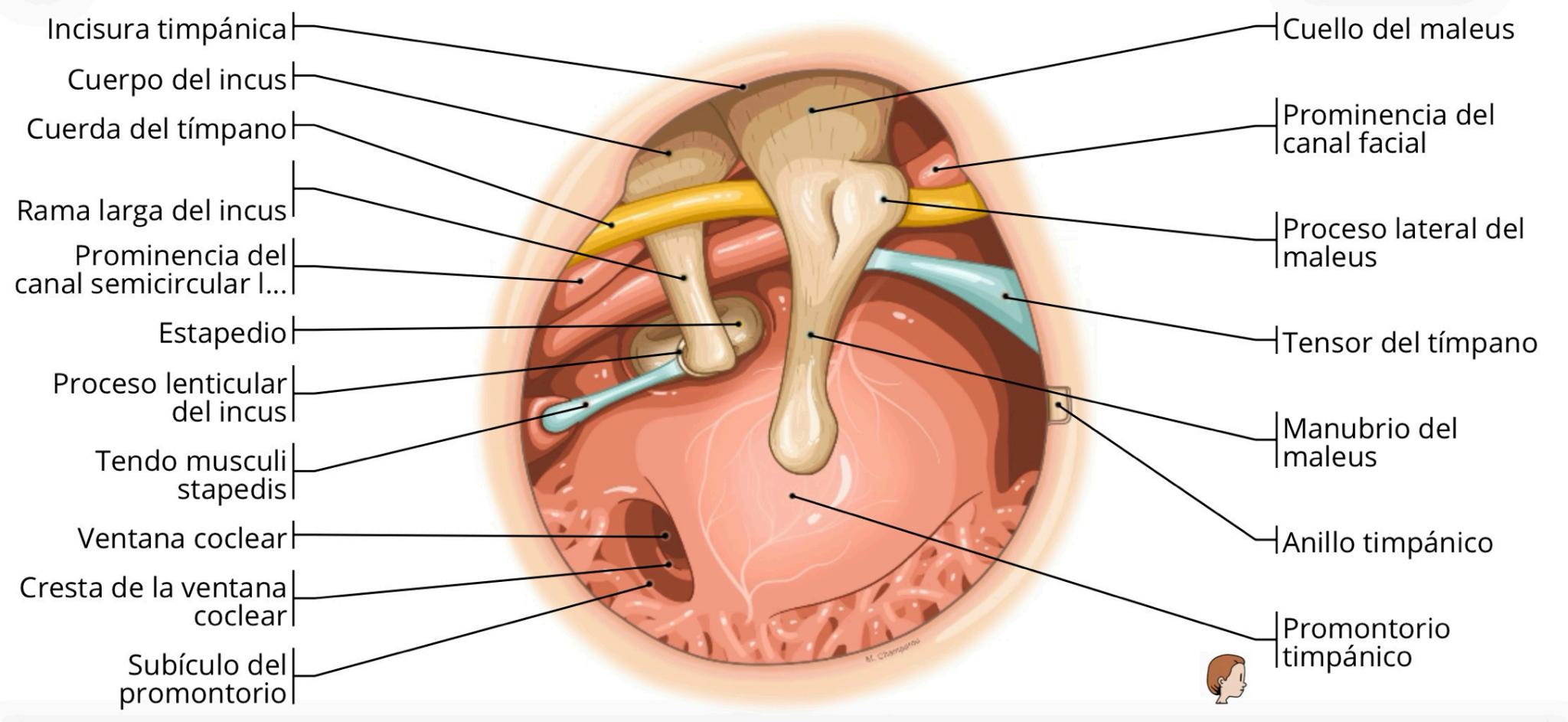 En la imagen se observan las múltiples estructuras dentro del oído medio, señaladas con su nombre.