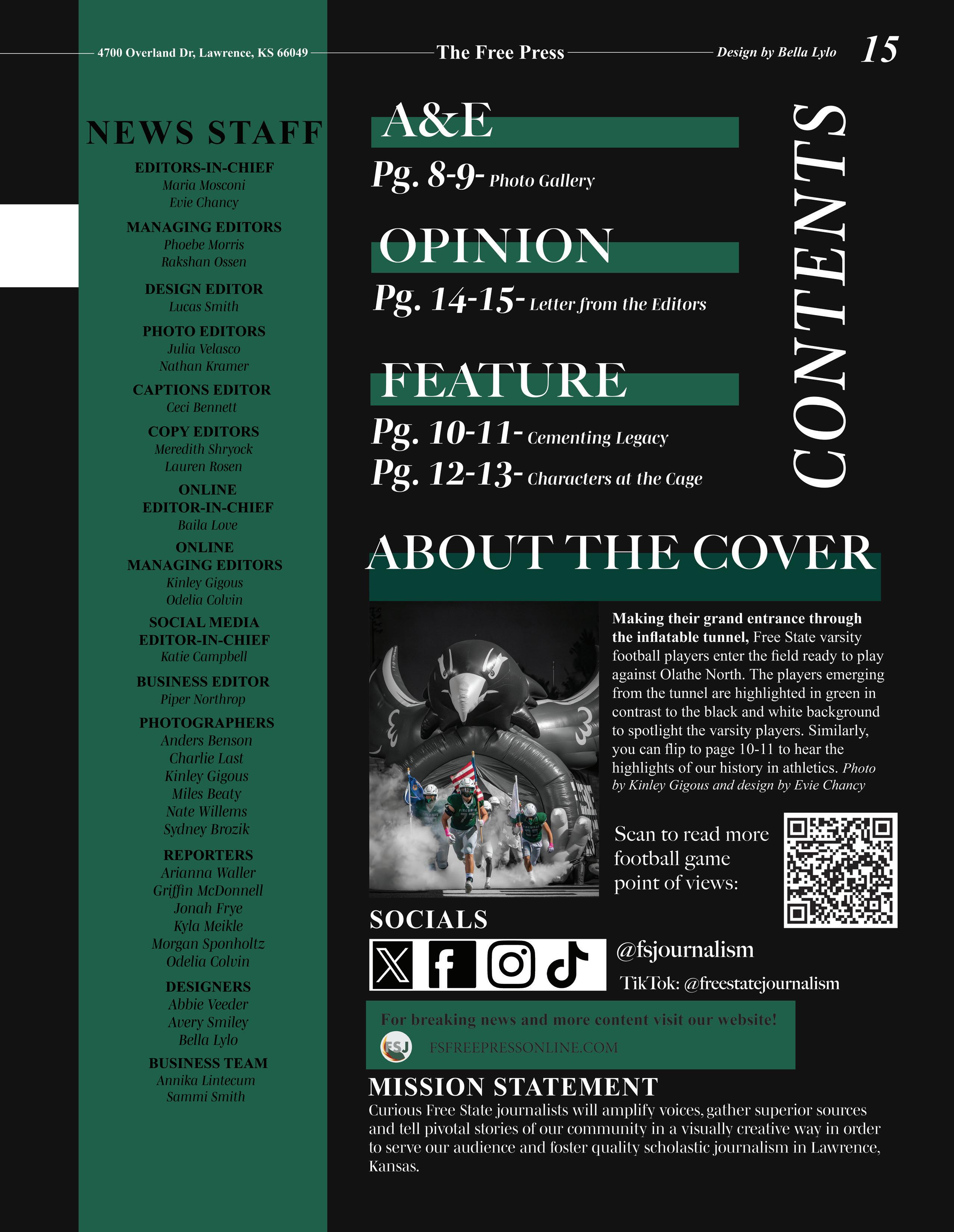 Th is fall, we are excited to carry on the tradition of producing a joint issue for the rivalry football game, collabrating with the Free Press. Last year, Free State editors Lily Wall and Nick Sprecker approached The Budget about collaborating on a limited-edition issue that celebrated the uniqueness of our schools amid a season of heated competition.