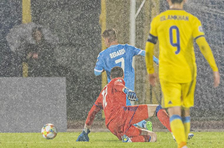 A metà novembre 2019, sotto un vero e proprio diluvio, i Biancazzurri ricevono il Kazakhstan a Serravalle. San Marino presenta un baricentro sensibilmente più alto, mettendo pressione alla difesa avversaria con le iniziative di Filippo Berardi. Sono però gli ospiti a passare con il colpo di testa di Zainutdinov. La replica di Palazzi è neutralizzata con affanno da Nepogodov, che salva il vantaggio e lo vede lievitare con Suyumbayev. Di lì a poco Schetin calerà il tris con cui si rientra negli spogliatoi. I Titani sono però vivaci e trovano meritatamente la rete al 77’. La prima gioia di Berardi è frutto anche dell’imbucata di Lunadei, poi il dribbling sul portiere e l’appoggio in fondo al sacco col destro della punta sammarinese.